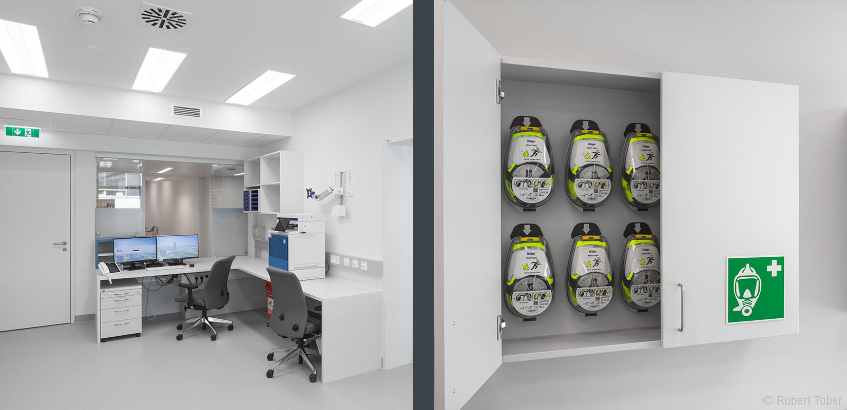 Unsere Planung sieht vor, dass Patient:innen im Brandfall bis zu 60 Minuten im Zimmer verbleiben können. Dafür wurde eine Zellenstruktur gebildet und jedes Modul brandschutztechnisch von den benachbarten Modulen abgetrennt. Mit der AKH-Feuerwache gibt es zudem eine Betriebsfeuerwehr, die in wenigen Minuten vor Ort ist und über Fluchtmaßnahmen entscheiden kann. Für eine Evakuierung ist jedes Obergeschoß als Brandabschnitt ausgebildet und in drei Evakuierungsabschnitte unterteilt. In Kombination mit den Personen- und Lastenaufzügen, von denen sich jeweils zwei in den Treppenhäusern an den Stirnseiten des Gebäudes befinden, ermöglicht das Konzept eine optimale Entfluchtung: So kann unabhängig vom Ort des Brandausbruchs stets in den benachbarten Brandabschnitt auf gleicher Ebene oder über eine Aufzugsanlage evakuiert werden.